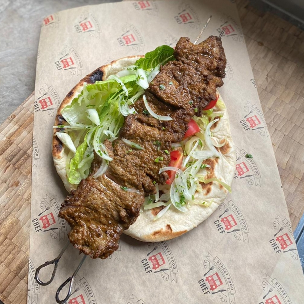 یک سیخ کوبیده مخصوص ۱۸۰ گرمی، نان لواش، گوجه کبابی، سیب زمینی، لیمو، ترشی کلم، فلفل کبابی، کره