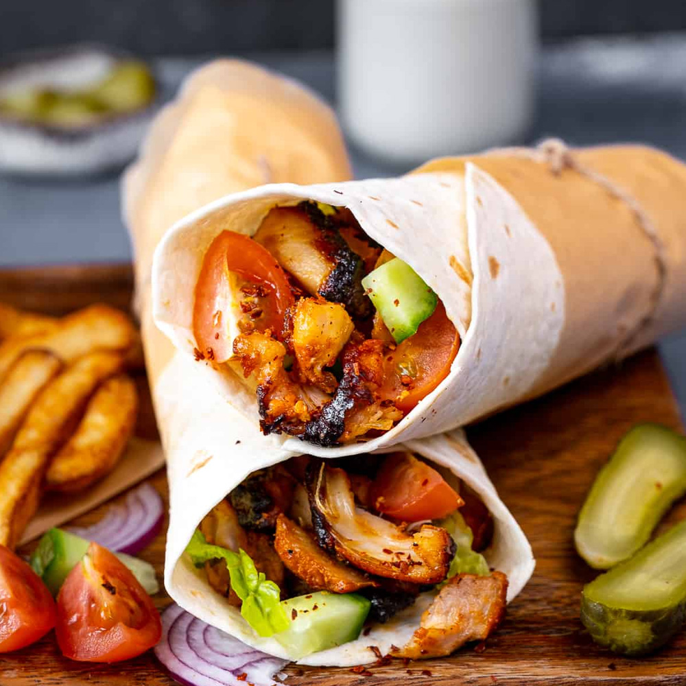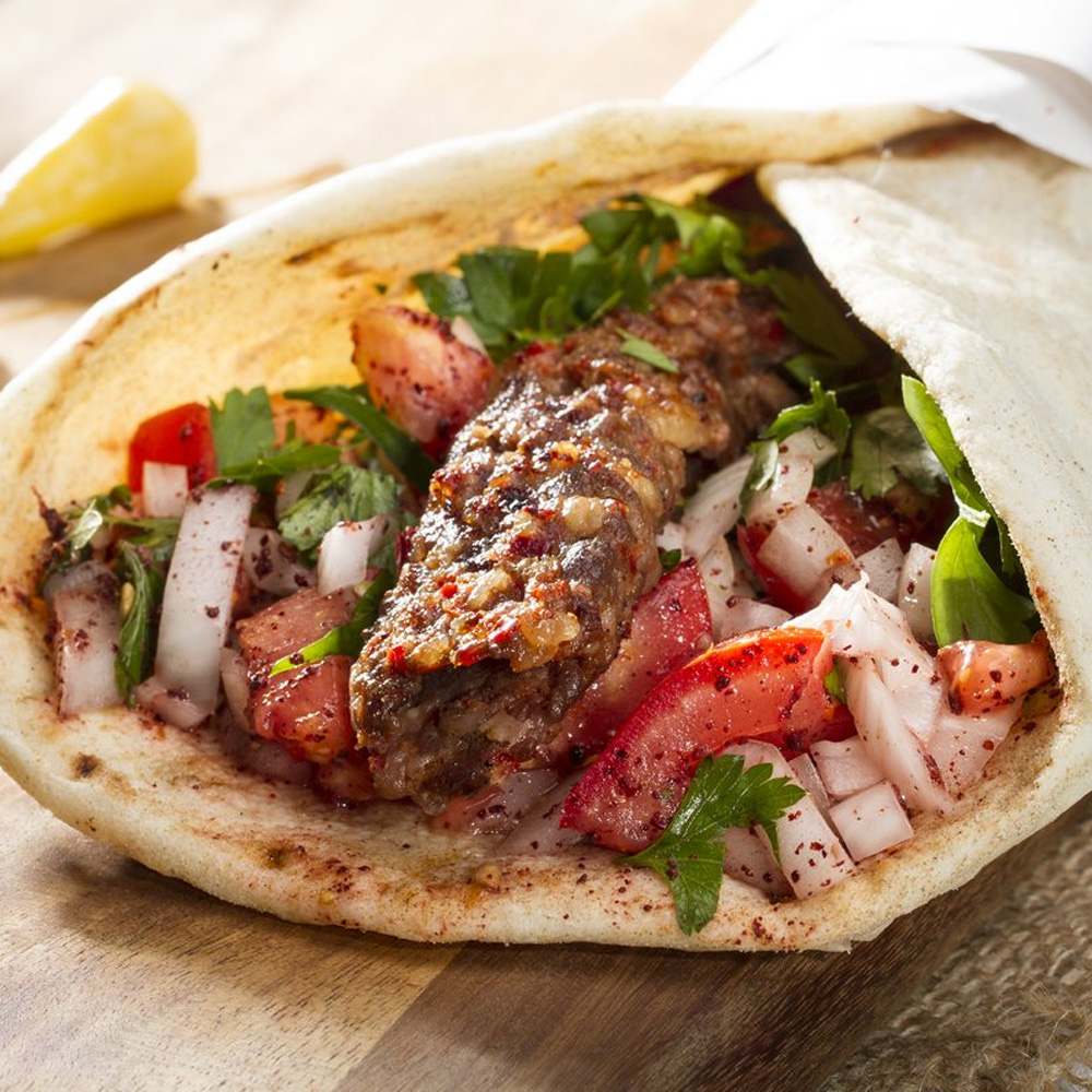 ۲ سیخ کباب کوبیده گوشت گوسفندی ۱۰۰ گرمی پیچیده شده در نان تافتون همراه با ریحان و پیاز جعفری، دورچین، سیب زمینی سرخ شده، جعفری، لیمو یا نارنج، سس کچاپ، خیارشور