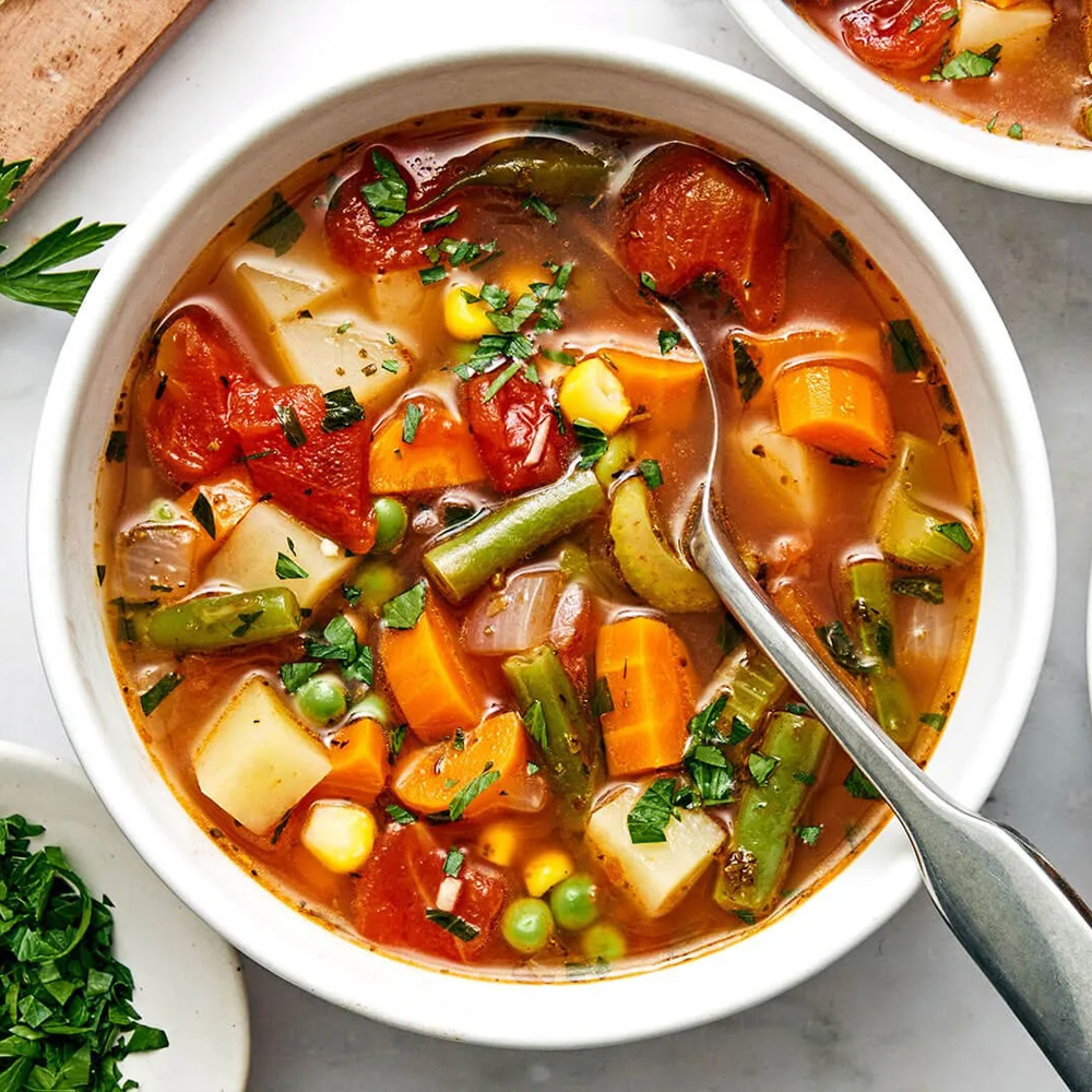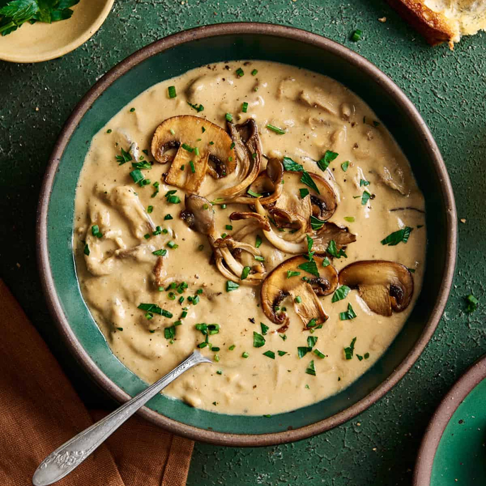 یک پرس سوپ قارچ و سبزیجات، سینه مرغ ریش ریش شده، قارچ، هویج، جو، سبزی سوپ، شیر