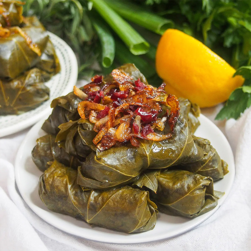 ۵ عدد دلمه برگ مو، گوشت چرخ شده گوسفندی، برنج ایرانی، تره، مرزه، لپه، برگ مو، دورچین: ریحان، لیمو ترش