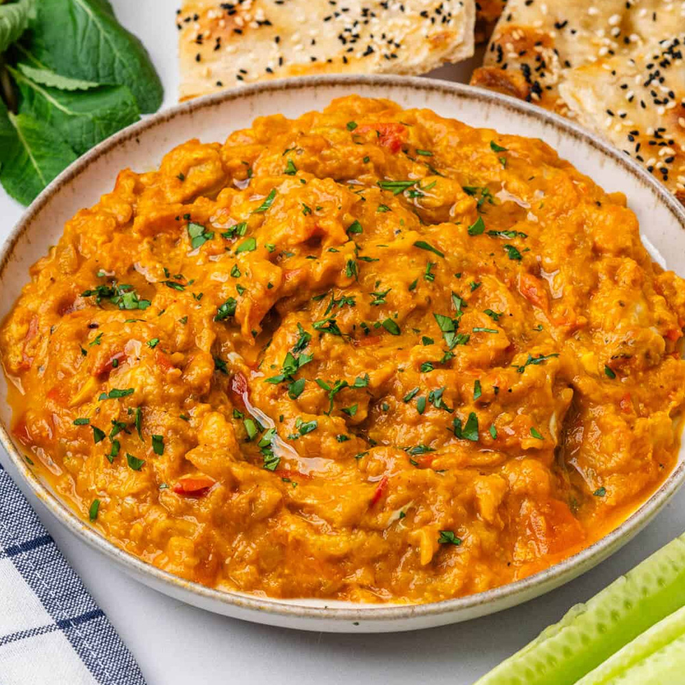 ۳۰۰ گرم کشک بادمجان، بادمجان سرخ شده، کشک، پیاز داغ، نعنا داغ، ۴ تکه نان تافتون یا لواش